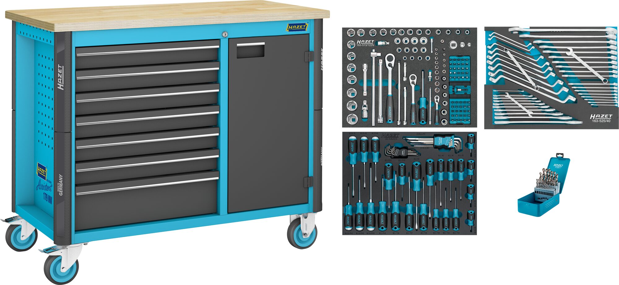 HAZET Werkbank ∙ fahrbar Assistent 179NW ∙ Sortiment 179NW-7/228 ∙ 228-teilig ∙ Schubladen, flach: 6 x 81 x 522 x 398 mm ∙ Schubladen, hoch: 1 x 166 x 522 x 398 mm